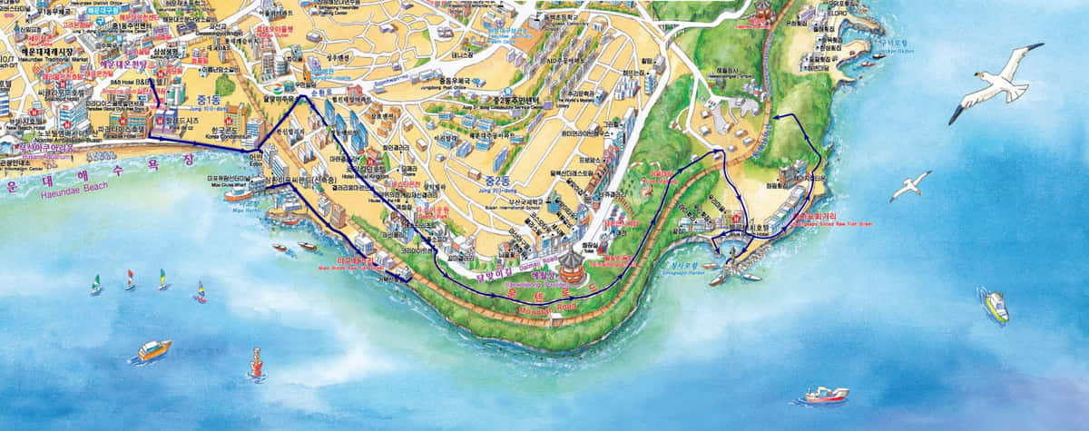 海雲台海水浴場、尾浦港、迎月路、月光浴路、青沙浦港行程路線