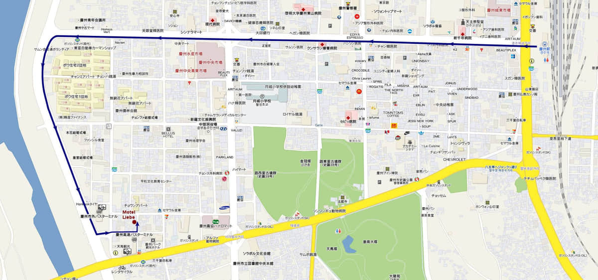 Motel Liebe 在慶州長途客運站和高速客運站附近, 但離開慶州火車站甚遠。 從火車站步行前往 Motel Liebe 約四十分鐘。