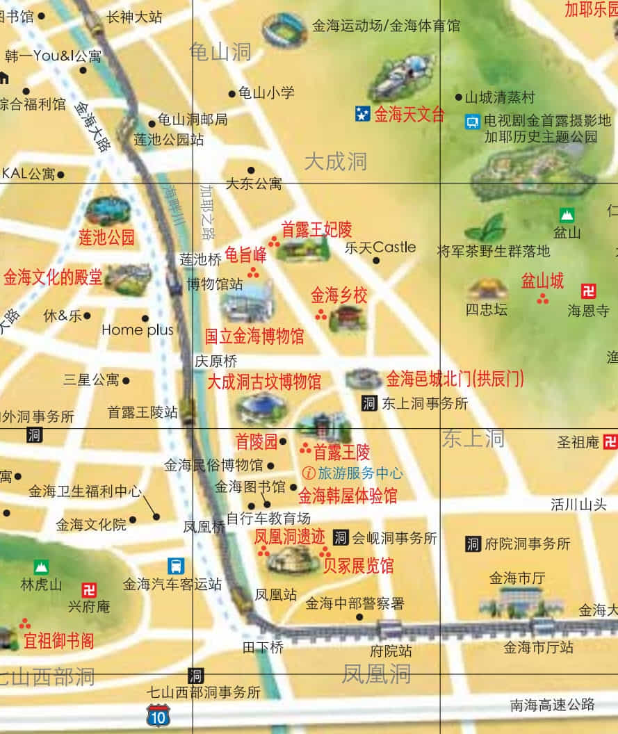 金海市有很多值得遊覽的景點, 可花幾天時間慢慢欣賞。如果只有一天的時間, 建議遊覽集中於輕鐵鳳凰站和博物館站之間的景點。